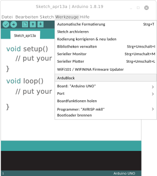 Wenn sich in dem Ordner „tool“ eine ArduBlock-jar-Datei befindet, wird diese beim Start der Arduino IDE mit aufgerufen. Unter „Werkzeuge“ findet sich dann der Eintrag „ArduBlock“, über den das Programm gestartet werden kann.